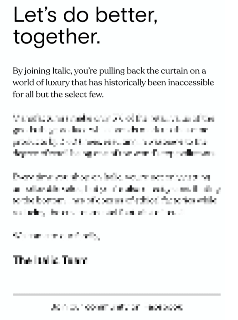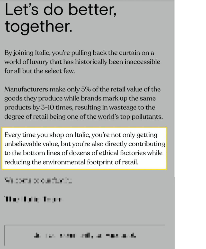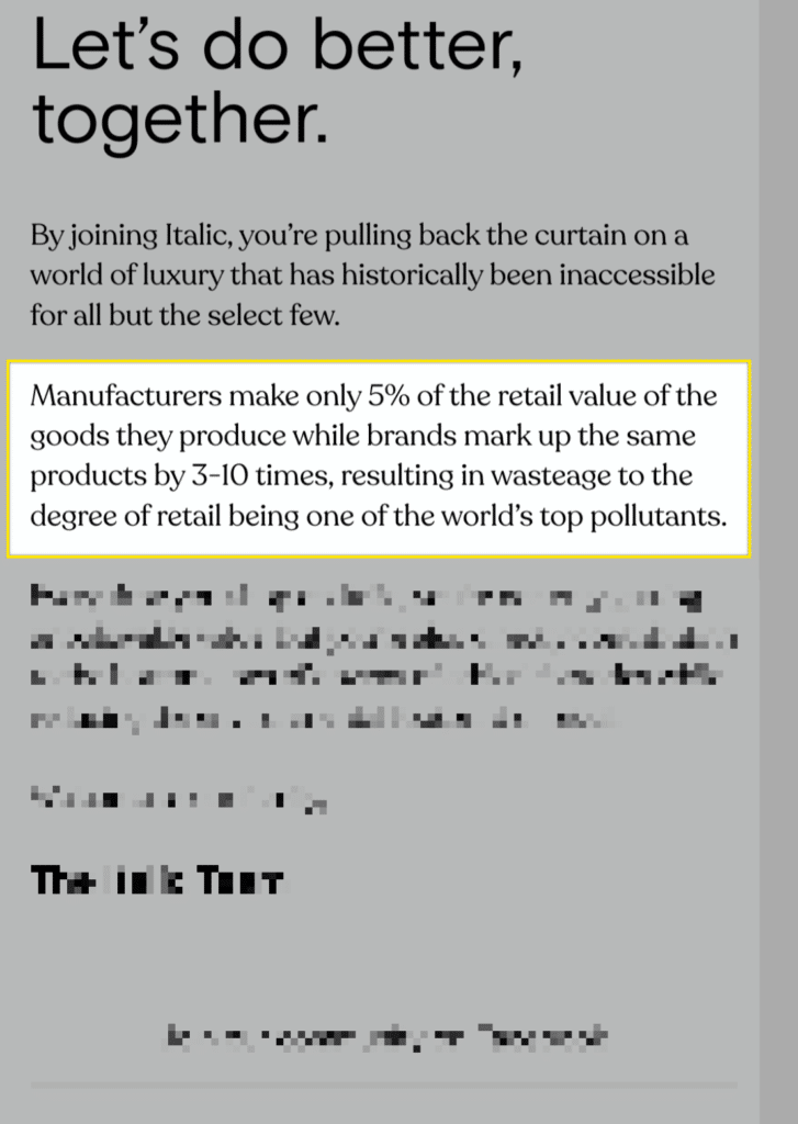 Die heutige Email der Woche schafft genau das. In wenigen Sätzen Text grenzt sie die Modefirma Italic von ihrer Konkurrenz ab, stellt sie als besser dar und bringt Leser an Bord für ihre Mission.