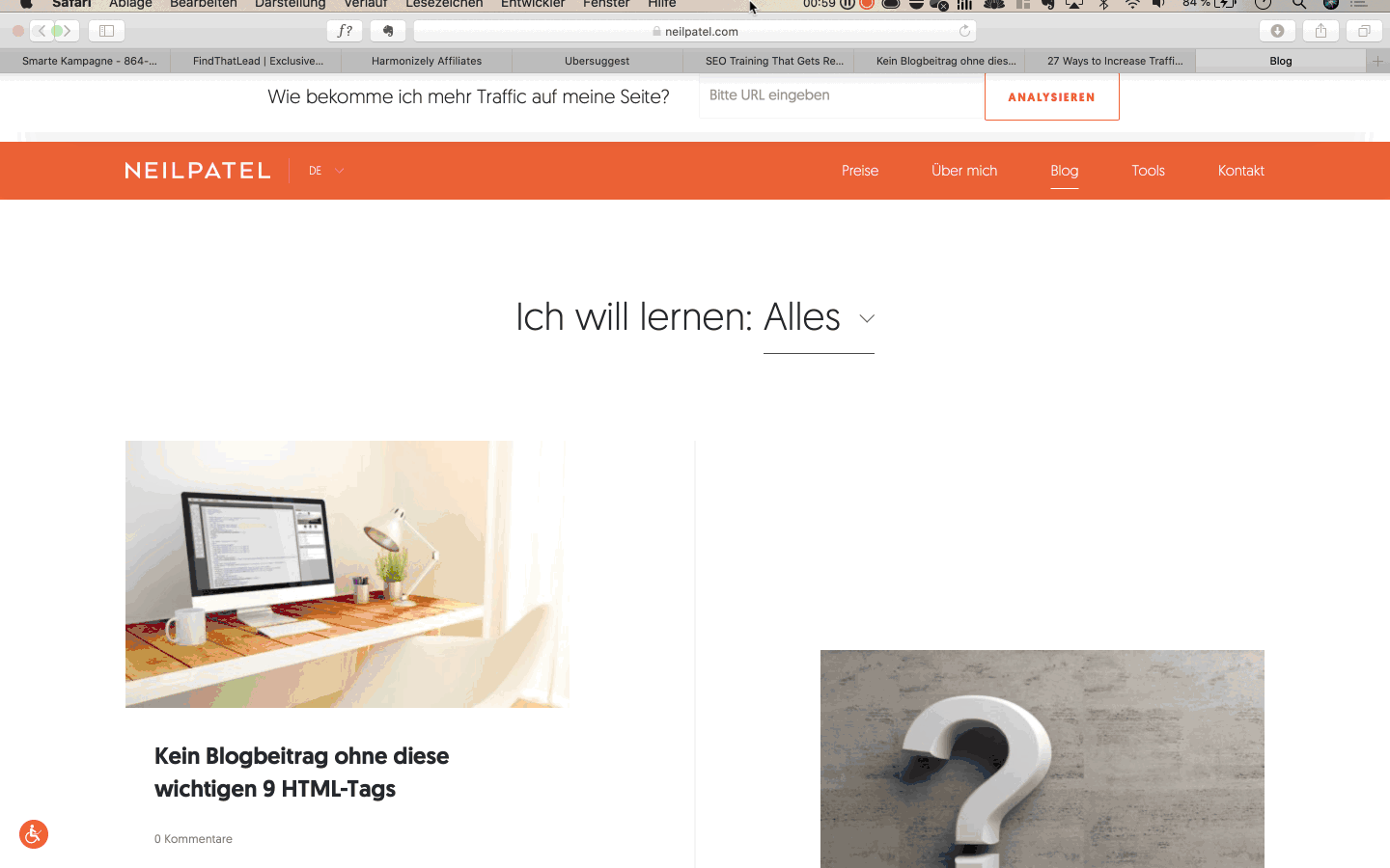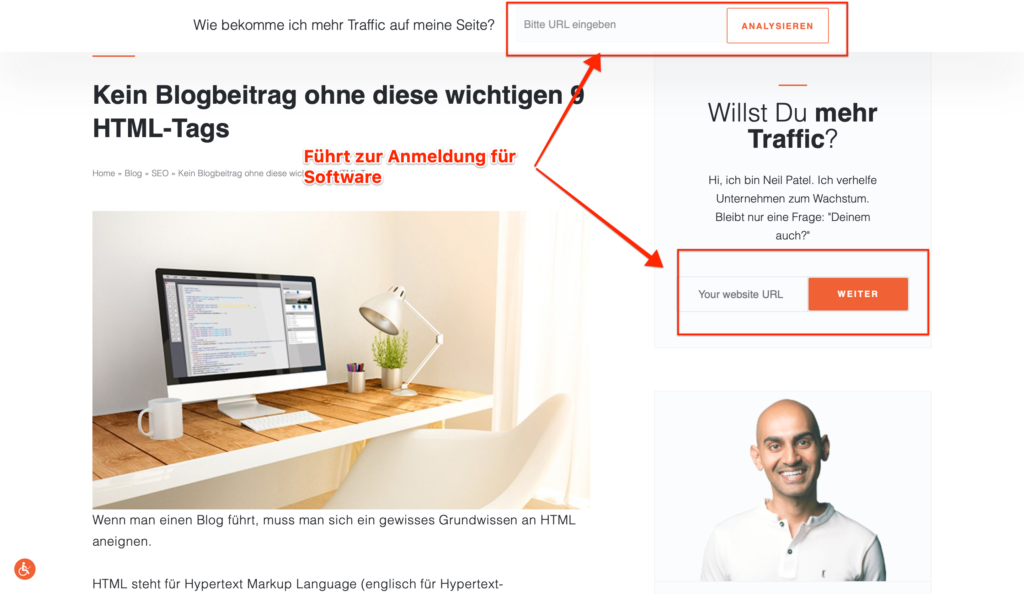 Neil nutzt seinen Blog für Conversions. Auf seiner hochoptimierten Seite sind überall Links zu seiner Software Ubersuggest.