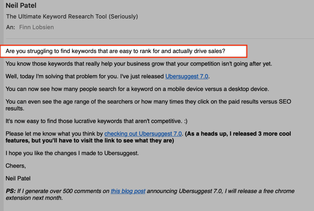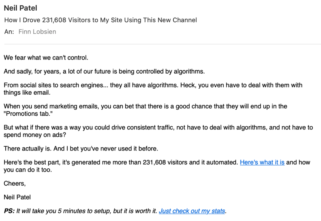 Neil Patel ist einer der Experten für SEO und Blogging. Und auch Email-Marketing hat er drauf. Und zwar mit Emails, die sich lesen wie ein Klebezettel an der Schranktür. Und das ist ein Kompliment.