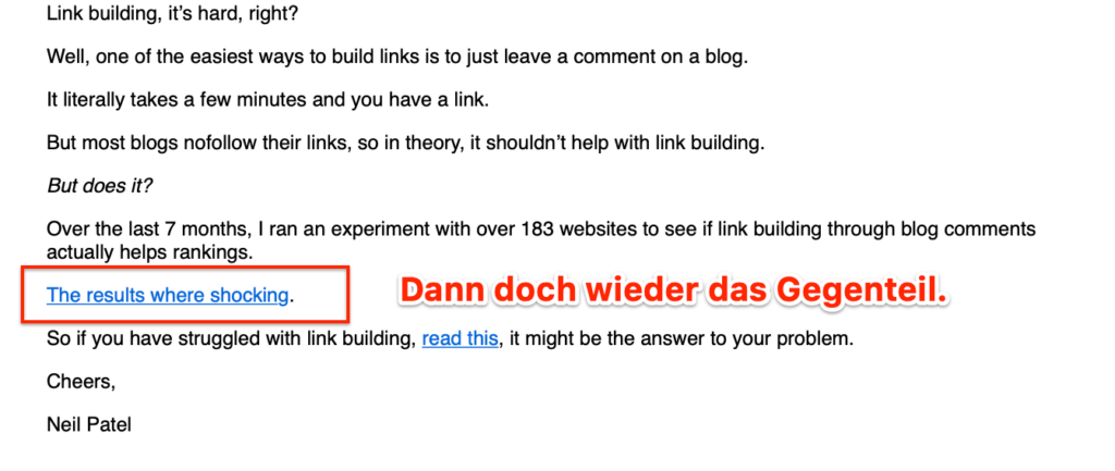 Wir klicken nicht auf Artikel, wenn wir wissen, was drinsteht. Denn dann ist keine Neugier da. Wahrscheinlich sind auf Neils Liste Experten, die über Nofollow Links Bescheid wissen.