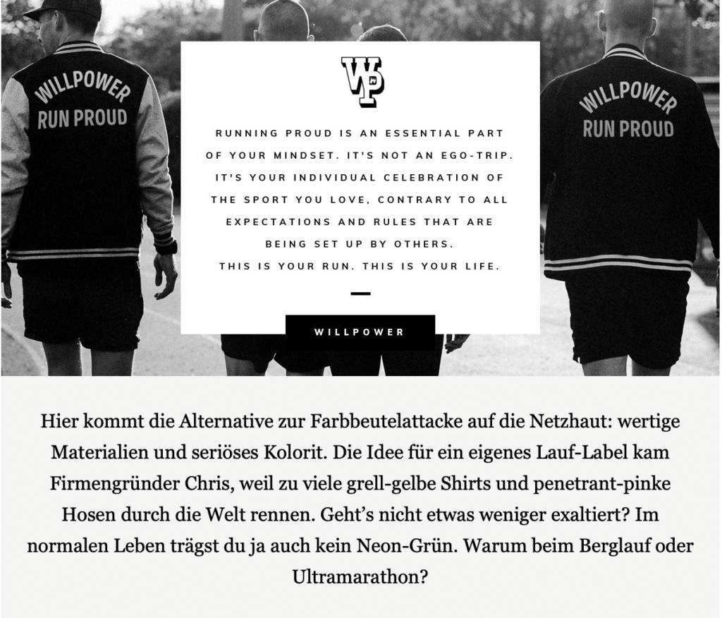 Relativ deutlich, denke ich. Hier aber besonders cool: Heldbergs erwähnt die Story des Firmengründers. Das funktioniert meistens—selbst wenn’s so simpel ist wie „Ich hatte keinen Bock mehr auf gelb, also hab ich schwarz gemacht“.
